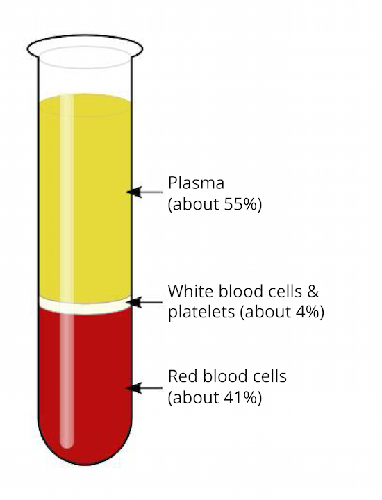 Figure 1: The average composition of blood. In this example, the blood is shown after spinning in a centrifuge so the different elements are separated: the heavier red blood cells at the bottom, then the white blood cells and platelets in the center, and the plasma at the top. The percentage of red blood cells is also known as hematocrit.