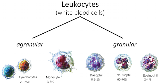 Figure 5: Leukocytes, or white blood cells, are classified into two groups: granular and agranular. Each of these groups are further broken down into different subtypes. (Leukocyte images via "Blausen gallery 2014" in the Wikiversity Journal of Medicine, DOI:10.15347/wjm/2014.010.)