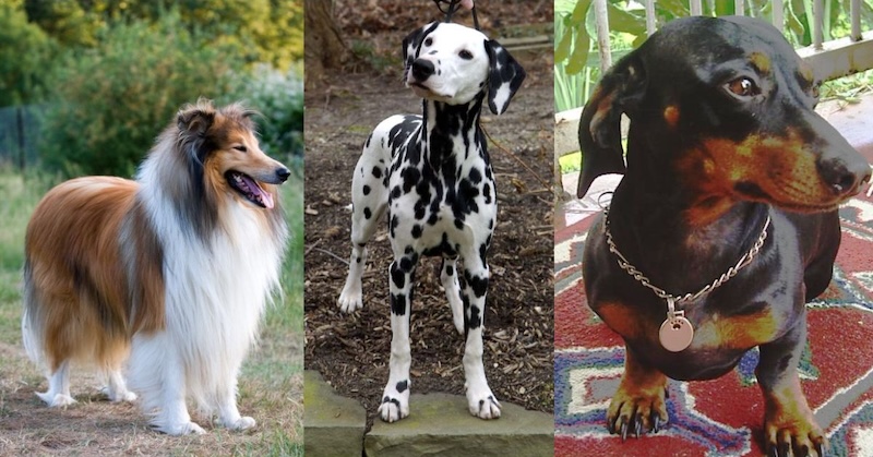 Figure 4: Dogs with different traits. The collie (left) is frequently used to herd sheep and other livestock. They are bred for their thick coats, which protect them from injury and from intemperate weather while they work, and for their intelligence. The Dalmatian (middle) is similarly intelligent, and is bred for its distinctive black and white coat. The dachshund (right) is a short-legged, elongated dog, originally bred to chase rabbits and other small game living in burrows.