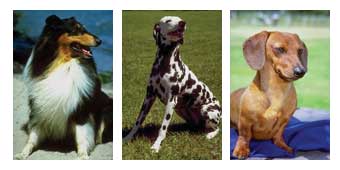 Figure 4: Dogs with different traits. The collie (left) is frequently used to herd sheep and other livestock. They are bred for their thick coats, which protect them from injury and from intemperate weather while they work, and for their intelligence. The Dalmatian (middle) is similarly intelligent, and is bred for its distinctive black and white coat. The dachshund (right) is a short-legged, elongated dog, originally bred to chase rabbits and other small game living in burrows.
