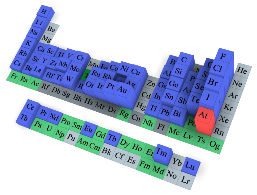Figure 11: A representation of the periodic table in which higher columns indicate more negative electron affinity values.