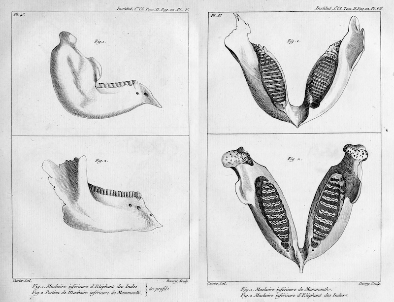 Cuvier noticed that both Indian elephants and the extinct mastodons had ribbon-like teeth adapted for grinding plant materials. However, the elephant (Figure 2, top left and bottom right) had fewer and flatter teeth, resulting in wider ribbons than in the mastodon’s teeth (Figure 2, top right and bottom left). Eventually, Cuvier would assemble a museum of animals no longer found on Earth—fossils—fueling the new science of paleontology.