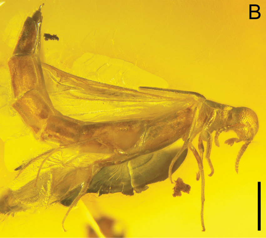 Most fossils are found in sedimentary rocks with a watery past. But rarely, fossils can form on land. This often occurs when animal or plant remains are quickly buried in a mudslide, sandstorm, or volcanic eruption. Some extinct animal species have been discovered in hardened tree resin (“amber”) and nowhere else. For example, Japanese postdoctoral student Shuhei Yamamoto collaborated with colleagues in Ukraine and Russia to describe a new species of ship-timber beetle encased in Ukrainian amber. (Yamamoto et al., 2022).