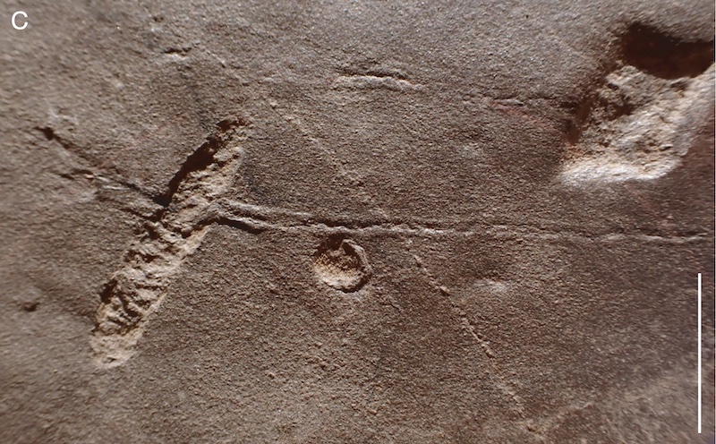 According to French paleontologists, the textures in Figure 4 were made by animals several hundred million years ago (Moreau and Gand, 2022), but the identity of the animals is tough to diagnose. Indeed, trace fossils (also known as “ichnofossils”) often get separate scientific names because they cannot always be definitively associated with the organism that made them. The cigar-like fossil is classified as Scoyenia gracilis (a scientific name for the tubular burrow of an unknown small animal). The long horizontal lines perpendicular to the burrow get their own classification as Diplopodichnus biformis, roughly translating to “the two-ridged trackway of an unknown animal walking on the sediment.”