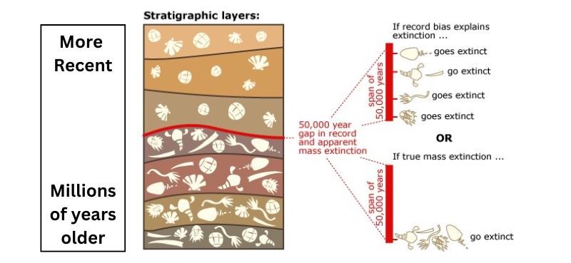 Consider Figure 6, a depiction of fossils found in deeper layers of rock (older) and shallower layers of rock (younger). The red line marks 50,000 years when no fossils are found in the rocks.