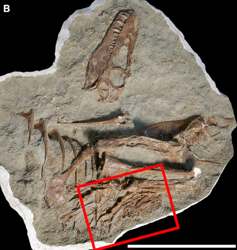 Figure 9: Fossilized remains of the tyrannosaurid dinosaur Gorgosaurus from Alberta, Canada (Citipes prey in red box).