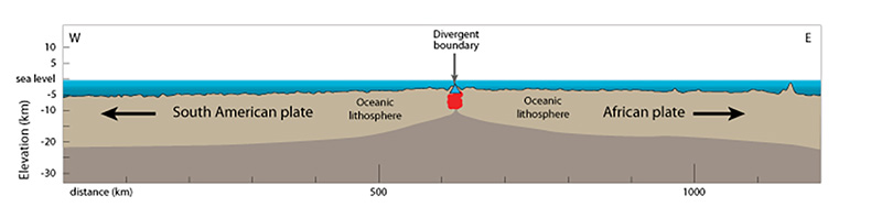 The most common divergent boundaries are the mid-ocean ridges that launched the plate tectonics revolution, and the Mid-Atlantic Ridge is a classic example (see Figure 3). Shallow earthquakes and minor basaltic lava flows characterize divergent boundaries at mid-ocean ridges. The seafloor at the ridges is higher than the surrounding plain because the rocks are hot and thus less dense and more buoyant, riding higher in the underlying mantle. As the rocks move away from the spreading center, they cool and become more dense and less buoyant. Spreading has been occurring along the Mid-Atlantic Ridge for 180 million years, resulting in a large ocean basin - the Atlantic Ocean.