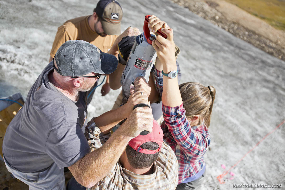 Figure 9: A field team led by Craig Lee and co-principal investigators David McWethy (Montana State University) and Greg Pederson (US Geological Survey) drilling a core from an ice patch in the Greater Yellowstone Area.