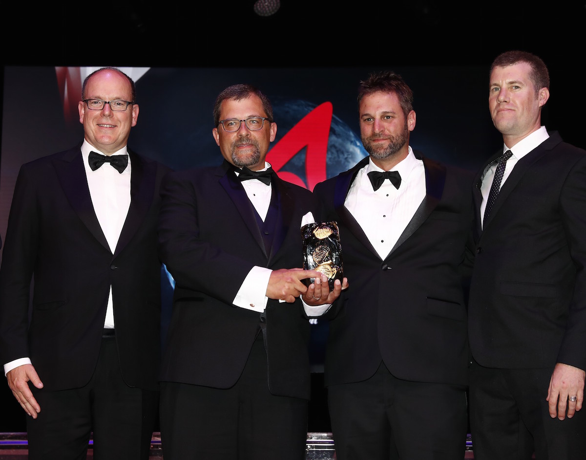 Figure 11: His Serene Highness Prince Albert II of Monaco, left, presented the Camp Monaco Prize to Craig Lee, Gregory Pederson (US Geological Survey), and David McWethy (Montana State University), pictured left to right, on June 30, 2016, in Monte Carlo, Monaco.
