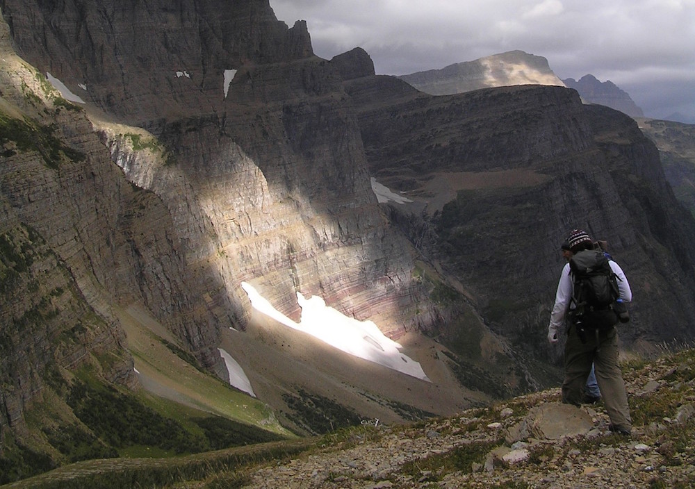 Figure 6: Don Sam of the Kootenai Tribe heads down a valley in Glacier National Park to investigate an ice patch.