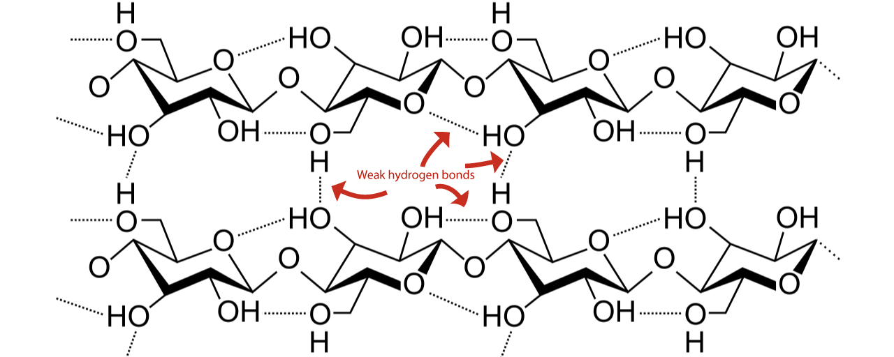 Figure 3: Structure of cellulose. The weak hydrogen bonds are easily broken.