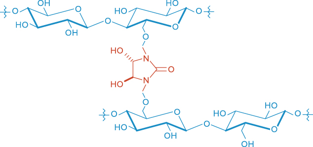 Figure 4: Cross linking of cellulose: Ring-shaped organic compounds replace the weak hydrogen bonds. This prevents the polymer chains from breaking apart.