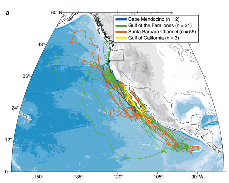 Figure 2: Individual migration patterns for 92 tagged blue whales (Balaenoptera musculus) tracked between 1994 and 2007 in the Pacific Northeast, color-coded by deployment location. These migration patterns represent a small subsample of a much larger statistical population: all of the possible blue whale migration patterns that occurred in the Pacific Northeast from 1994 to 2007. Image from Bailey, H., Mate, B.R., Palacios, D.M., et al. 2010. Behavioural estimation of blue whale movements in the Northeast Pacific from state space model analysis of satellite tracks. Endangered Species Research 10, 93–106.