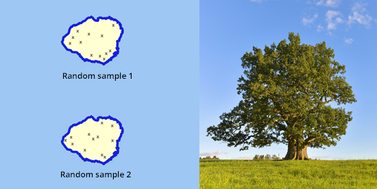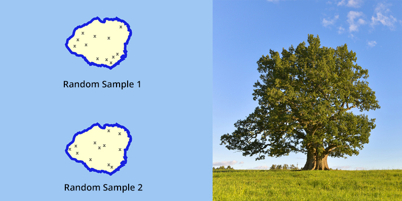 Figure 3: Example of random sampling. To collect a representative subsample of insects living on the oak trees on an island, researchers randomly selected 12 geographic coordinates throughout the island. The figure on the left shows what two random samples might have looked like, with each randomly selected location marked by an X. Every time the random sampling procedure is repeated, the distribution of sampling locations changes.