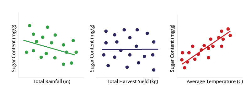 Figure 5: Linear regressions measure the relationship between an independent variable and a dependent variable. In the examples of simulated data above, sugar content of the tomatoes (the dependent variable) is weakly related to total rainfall (left graph) and strongly related to average temperature (right graph). Sugar content shows no relationship with the overall harvest yield (middle graph).