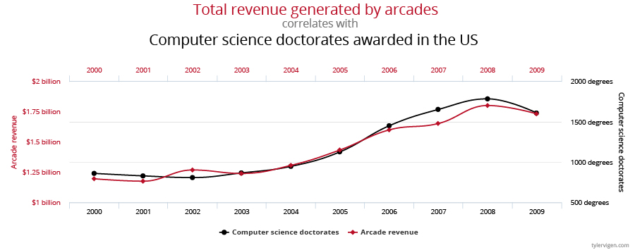 Figure 4: Correlation does not imply causation. Although the graph above shows a striking correlation between annual arcade revenue and advanced computer science degrees awarded, we cannot conclude that changes in one variable caused changes in the other. Data sources: US Census Bureau and National Science Foundation.