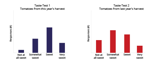 Figure 6: Inferential statistics can be used to analyze more qualitative data like the simulated taste-test data shown above. Statistical methods that compare the shapes of the distributions of the taste-test responses can help determine whether or not the difference in sweetness between the two tomato harvests is statistically significant.
