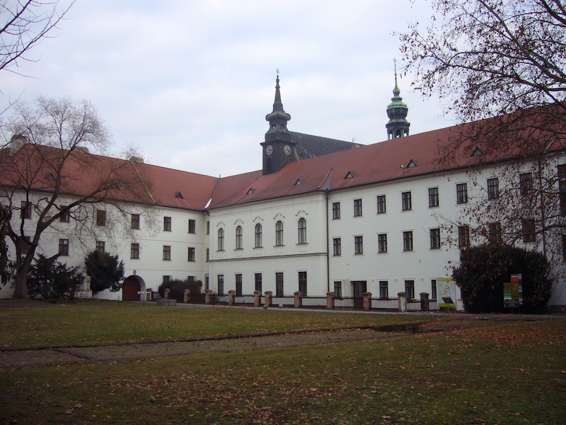 Figure 3: The monastery of St. Thomas at Brno with a picture of Mendel's gardens.