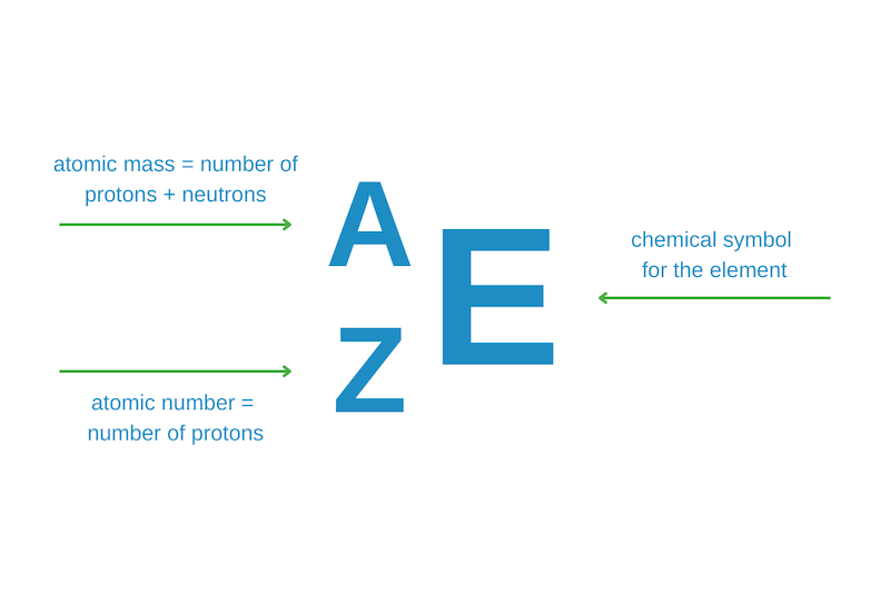 Another way to indicate isotopes is by writing them in isotopic notation. Figure 3 is a model of the notation. The symbol of the element is written with a superscript number and a subscript number to the left of the symbol. The superscript number gives the atomic mass; the subscript number gives the atomic number. Figure 3 shows what this model looks like.