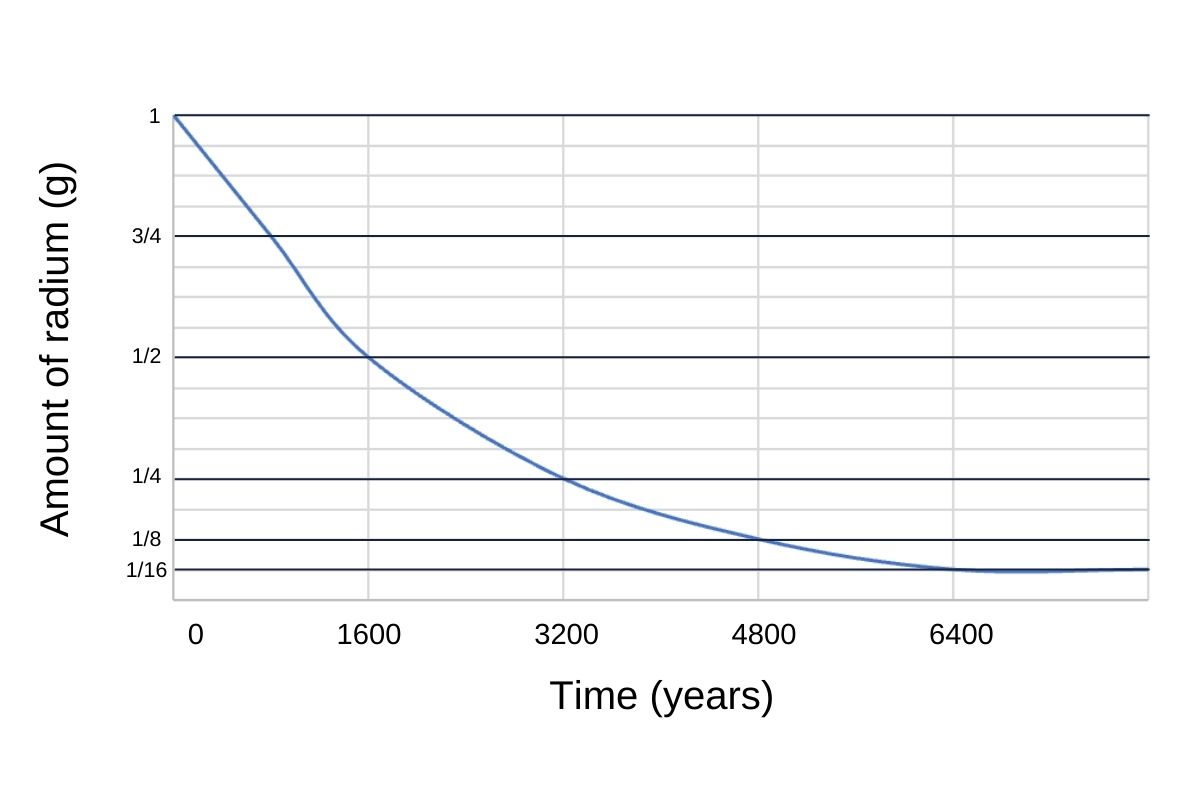 Figure 6: A graph of mass of radium versus time representing the half-life of radium-226.