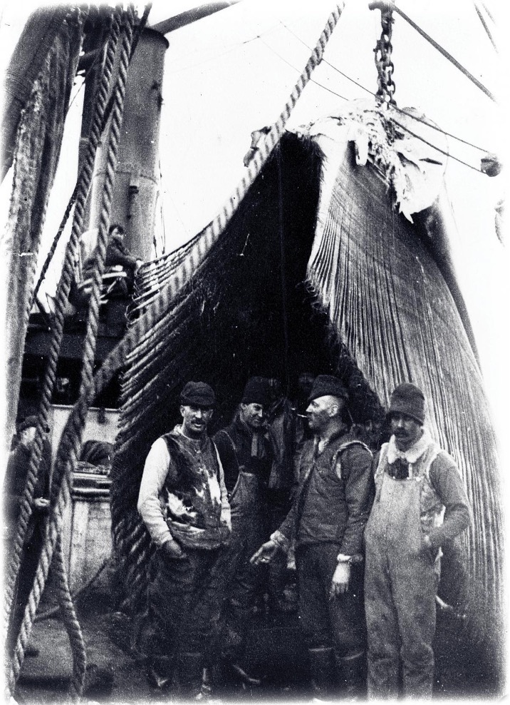 Figura 4: Cuatro hombres posando bajo barbas colgando de la cubierta de un ballenero, sin fecha, muestra el tamaño de las barbas de una ballena franca, un material de queratina en las mandíbulas superiores de los filtros. alimentando a las ballenas.