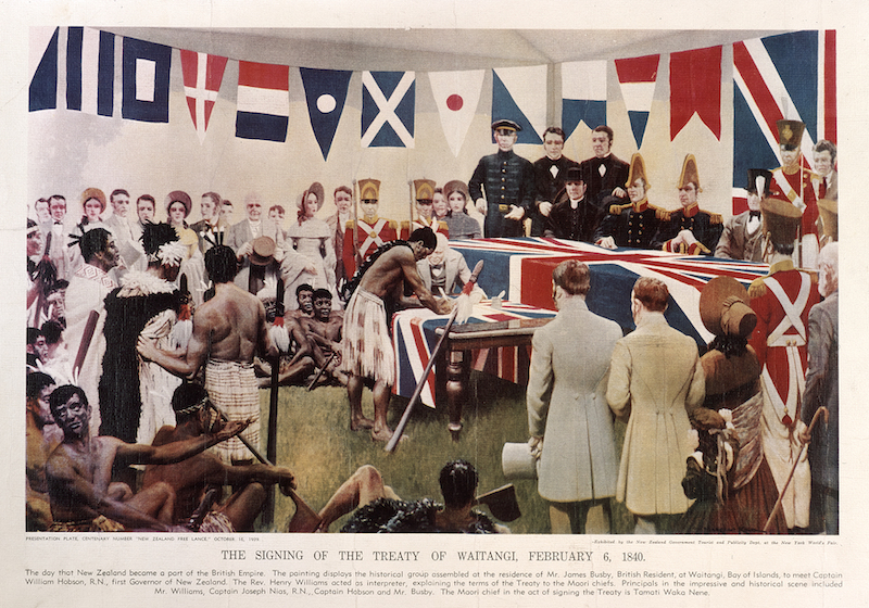 Figura 11: Representación de la firma del Tratado de Waitangi en 1840, que introdujo a Nueva Zelanda y los maoríes en el Imperio Británico.