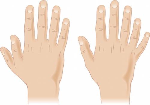 Figura 1: Las personas con el síndrome de Ellis-van Creveld a menudo tienen antebrazos y piernas más cortos, además de dedos de manos y pies adicionales (polidactilia), uñas de manos y pies malformadas y anomalías dentales.