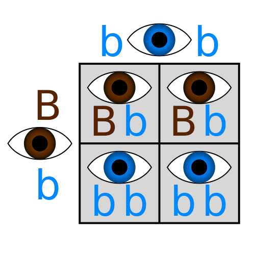 Figura 3: Reginald Punnett desarrolló un método visual para comprender los rasgos heredados. Llamado cuadro de Punnett, esta instancia muestra cómo la probabilidad del color de los ojos. Aquí, un padre de ojos marrones y un padre de ojos azules producen un 50 % de niños con ojos marrones (un rasgo dominante) y un 50 % de niños con ojos azules (un rasgo recesivo).