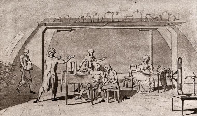 Picture this: We’re in the late 18th-century France, and a shirtless young man sealed inside an airtight mask sits in a room lined with shelves of jars. Pipes connect him to a large reservoir, part of a room-spanning arrangement of chemistry equipment. A one-way valve ensures that his exhalations are collected through the pipes as he breathes.