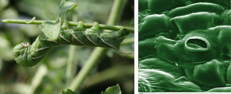 Figura 2: Foto de primer plano de un espiráculo de insecto, al lado de estomas de hojas.