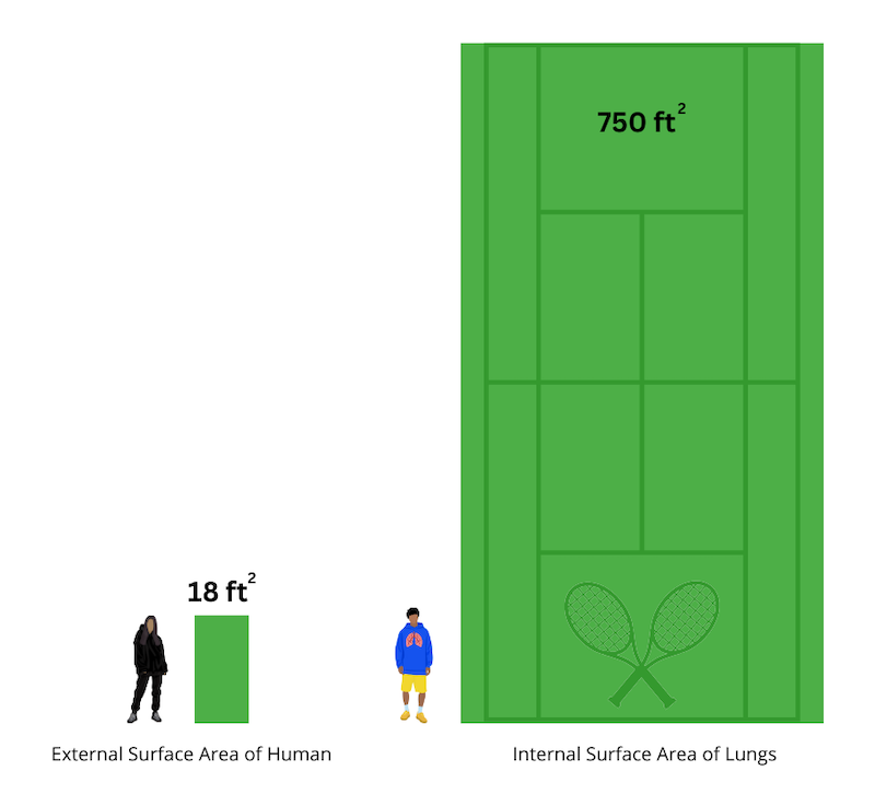 image ©Left: CC BY 4.0 DataBase Center for Life Science (DBCLS); Right: CC BY 3.0 Adrien CrettéEstimates of the total internal surface area within human lungs vary from 70 m2 to 140 m2 (750 ft2 to 1500 ft2)—roughly equivalent to the floor space of a large one-bedroom apartment or a little less than half of a tennis court. In contrast, the standard estimate of the external surface area of an adult human (our skin) is only about 1.7 m2 (18 ft2).