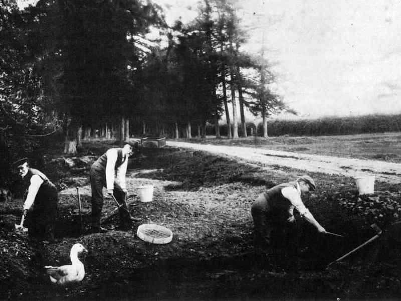 Figura 7: Charles Dawson y Arthur Smith Woodward (atrás a la derecha) con otros investigadores examinando el cráneo del Hombre de Piltdown.