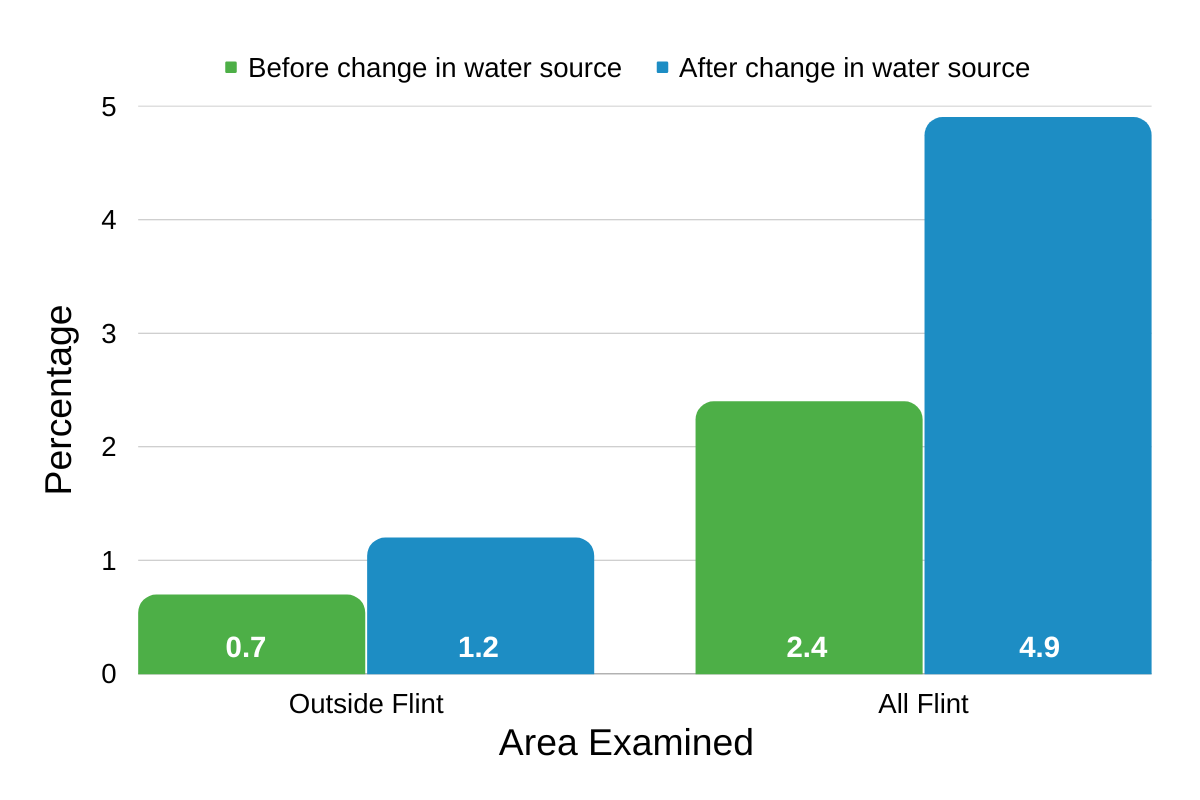 Figura 5: Un gráfico de barras que muestra los resultados del estudio de Hanna-Attisha. El gráfico muestra que un mayor porcentaje de niños en la ciudad de Flint, Michigan, tenían niveles elevados de plomo en la sangre en comparación con los que vivían fuera de Flint.