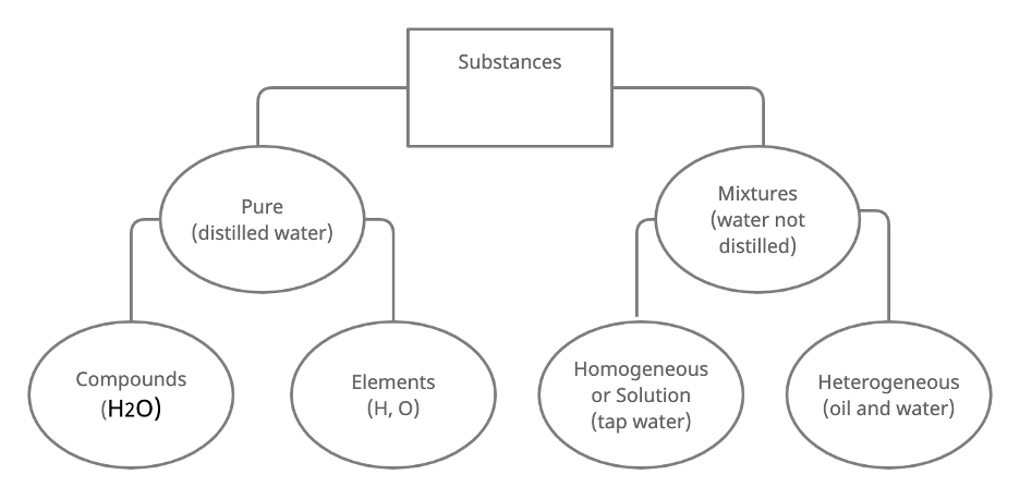 Let’s take what you have learned about water as a substance and use it to build a model for the classification of substances. The terms and examples you learned about water as a substance are used in the model.