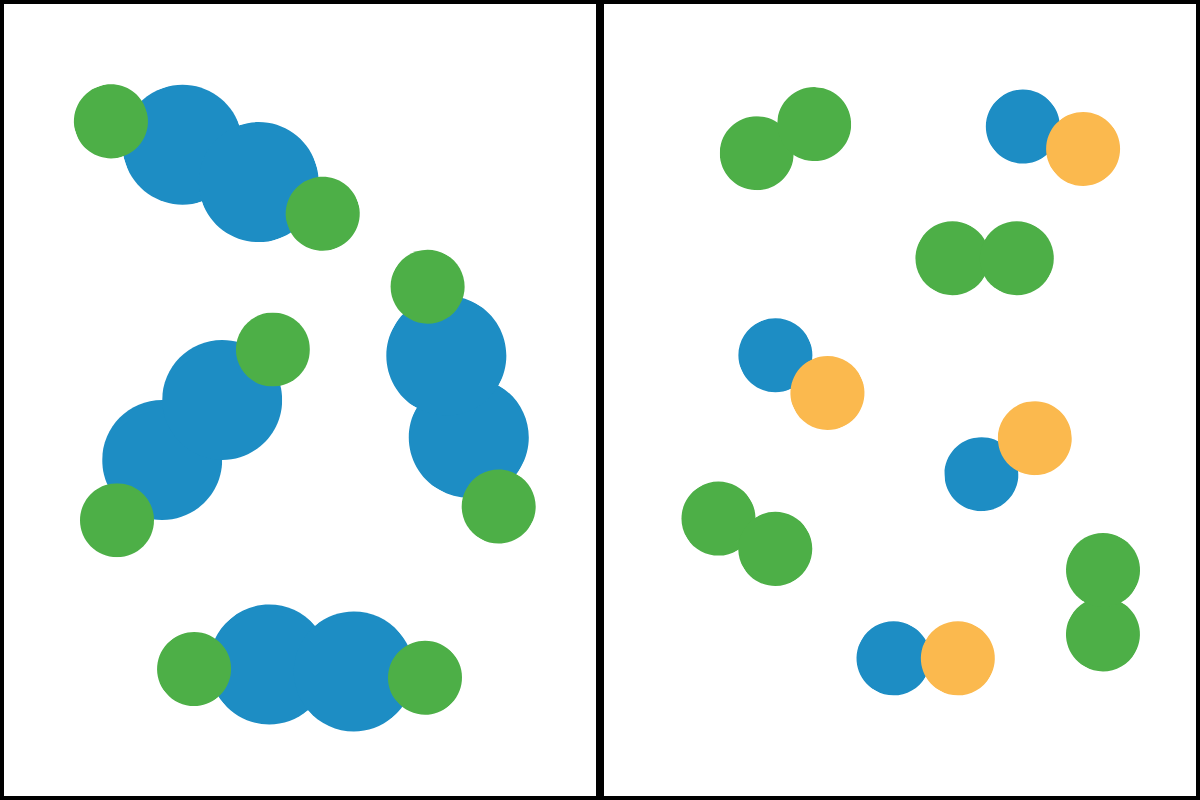 In Figure 7, the model on the left includes molecules that are all the same. This is a pure substance containing molecules of the same compound. What about the model on the right? There are molecules of two different compounds. One compound contains two atoms of different elements, represented by the blue and orange colors. The other compound has two atoms of the same element, as shown in green—a type of compound we call “diatomic.” We can’t tell whether this substance is heterogeneous or homogeneous on this scale. Sometimes it is difficult to classify a substance without more information.
