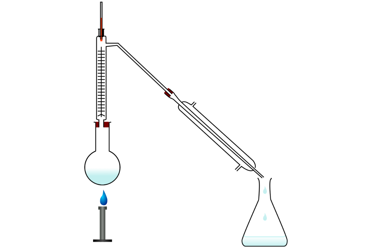 Figura 3: El proceso de destilación para purificar el agua. El agua, en el matraz de la izquierda, se hierve y se condensa en el tubo largo dejando atrás las impurezas.